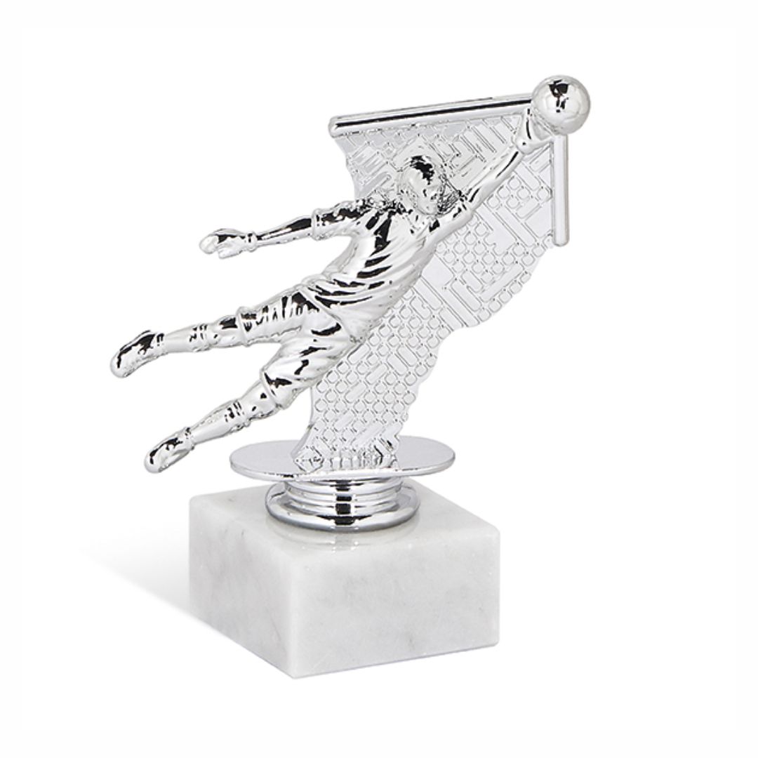 Srebrn plastičen pokal v z vratarjem in žogo.