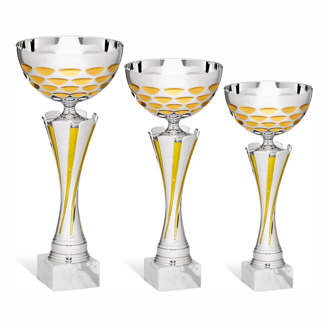 Trije kompleti, treh pokalov različnih višin v zlati barvi na belem kamnitem podstavku.