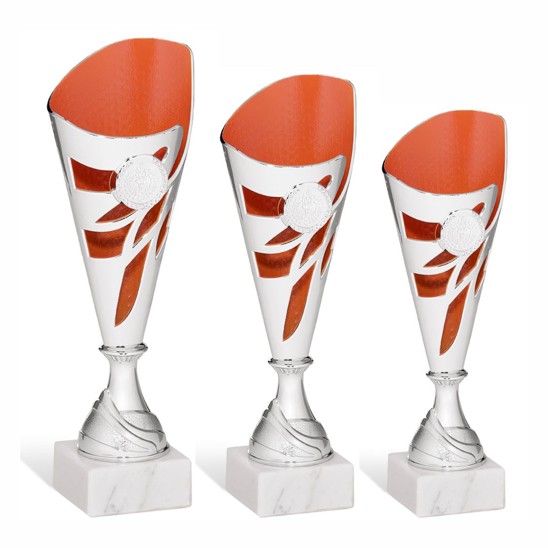 Komplet pokalov v srebrni in rdeči barvi na belem kamnitem podstavku z vstavkom, velikosti 25 mm.