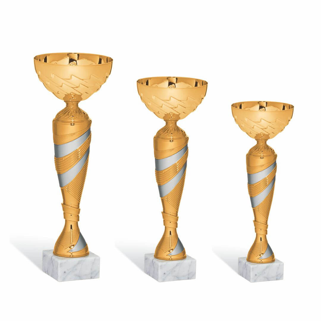 Komplet pokalov v zlati in srebrni barvi na belem kamnitem podstavku.