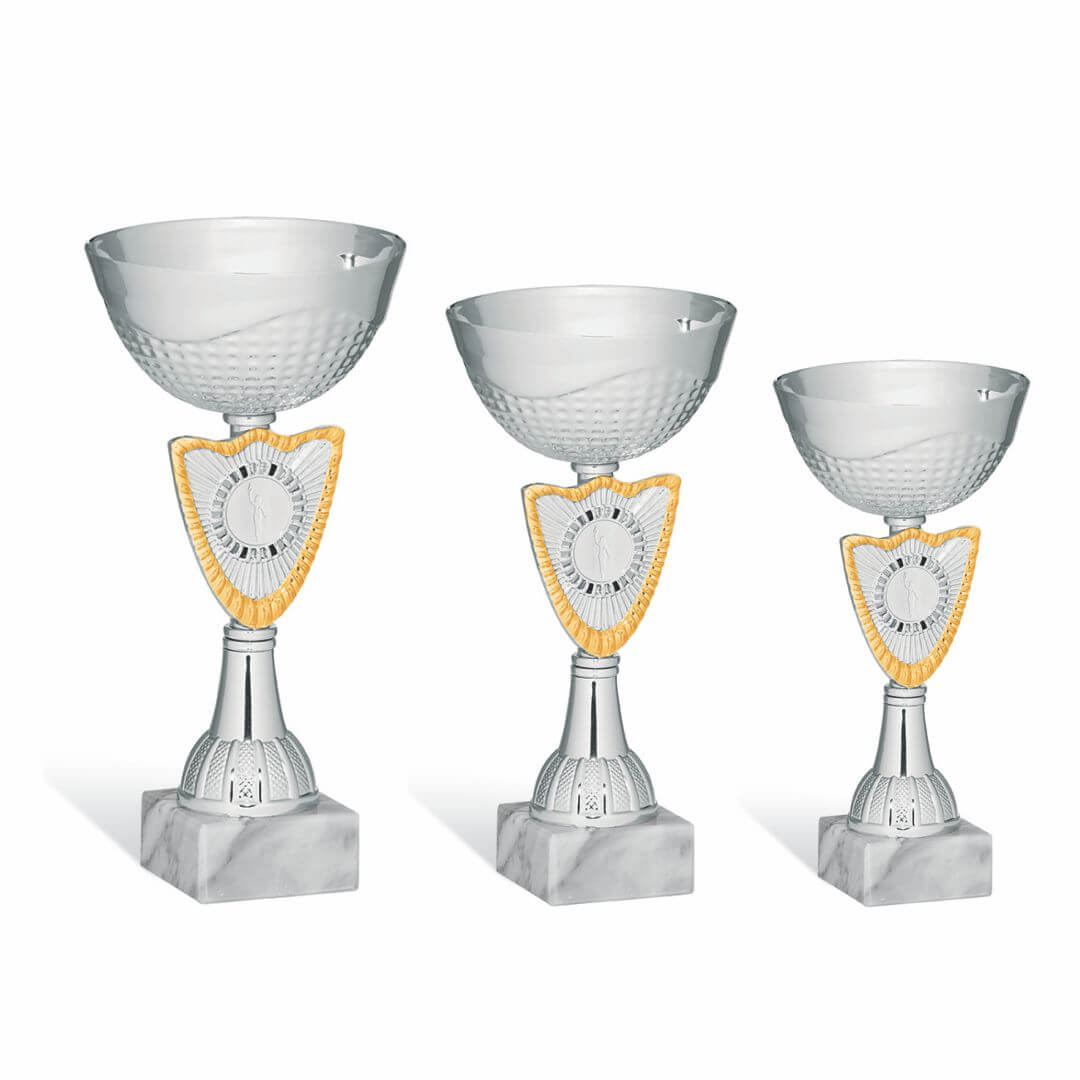 Komplet pokalov v srebrni in zlati barvi na belem kamnitem podstavku.