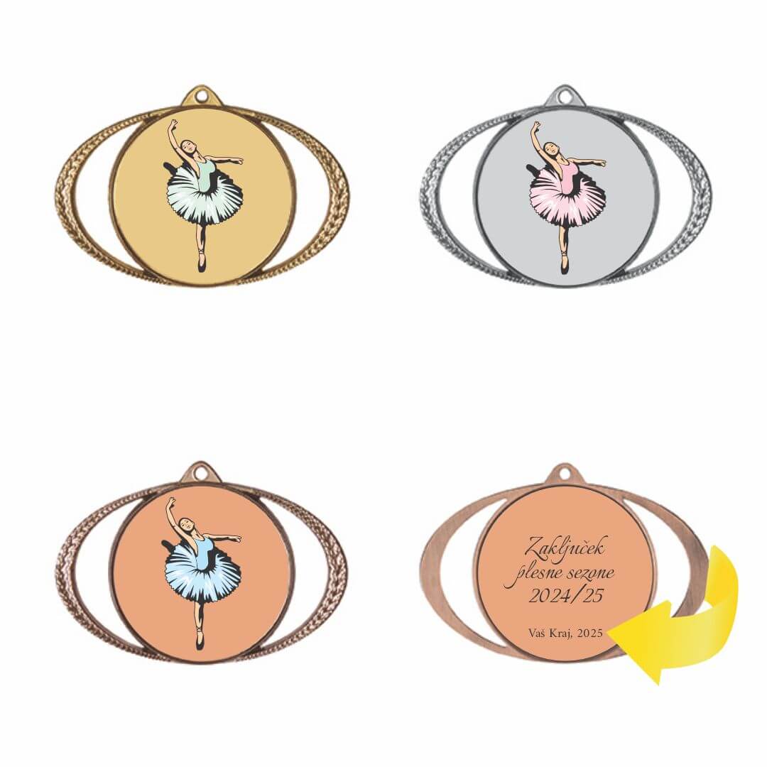 Ugodna 80 mm velika medalja v zlati, srebrni ali bronasti barvi z unikatno obliko.