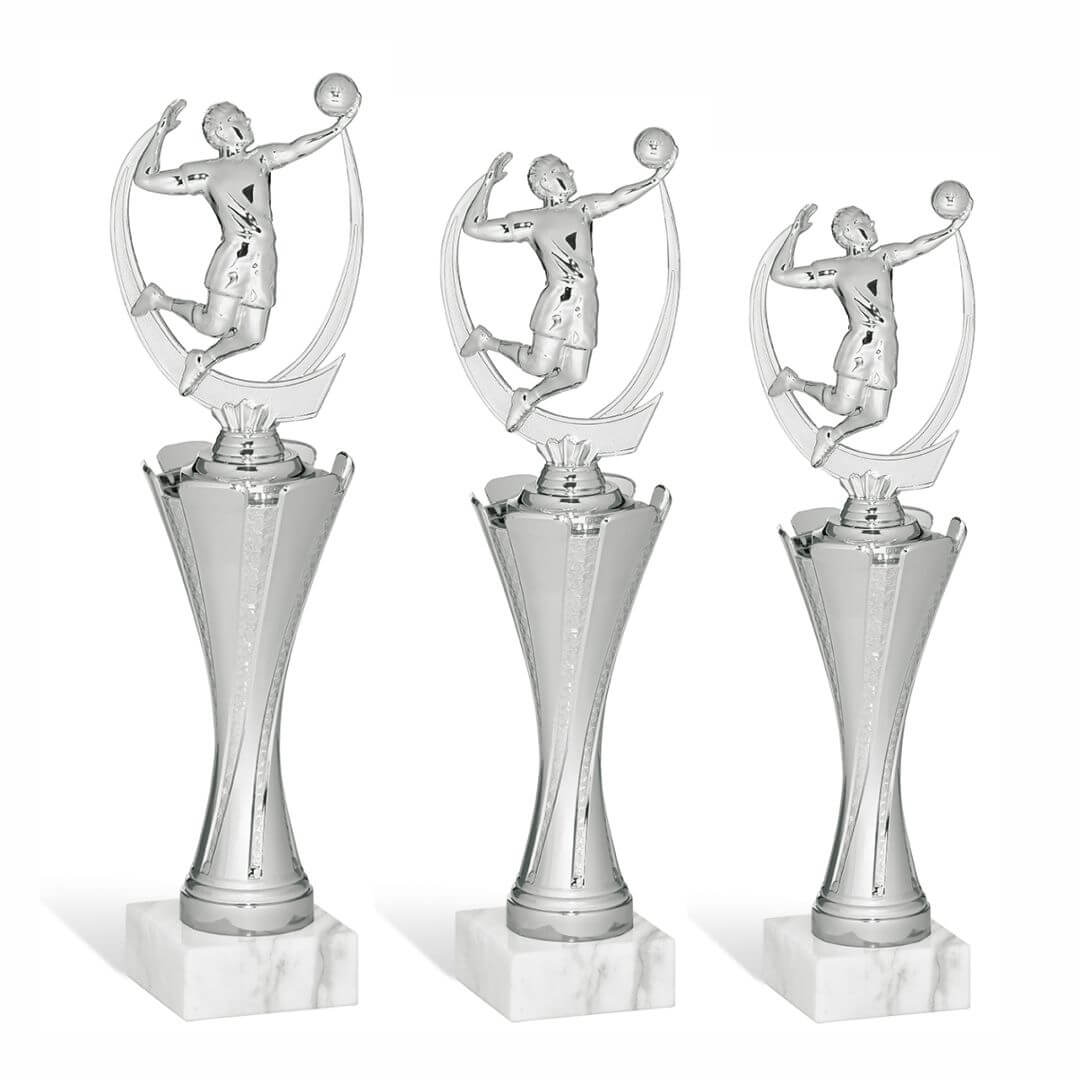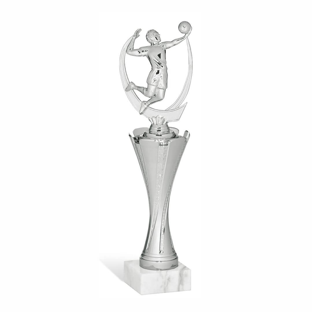 Plastičen pokal v srebrni barvi z motivom odbojkarja in žogo.