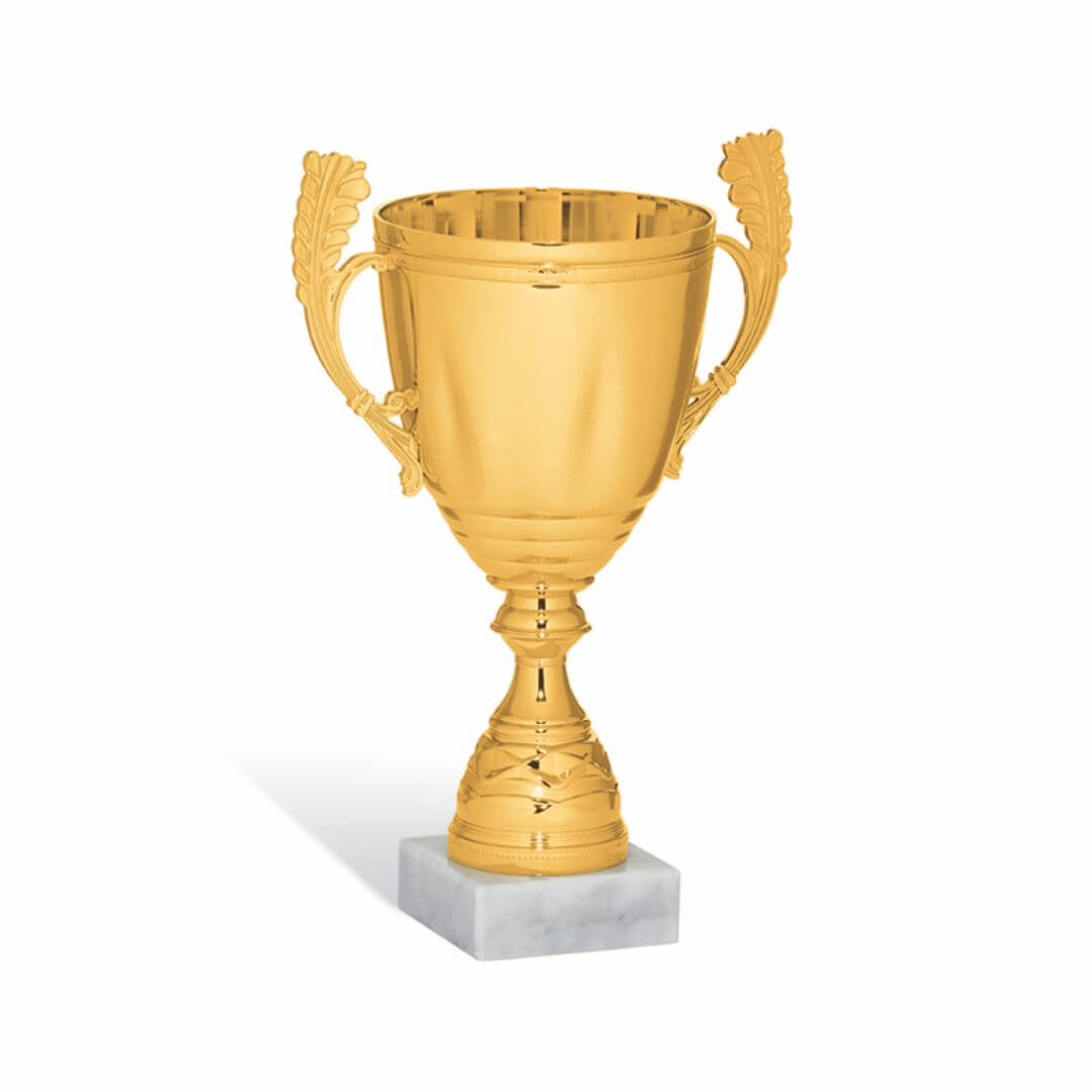 Komplet plastičnih pokalov zlate barve na belem kamnitem podstavku.