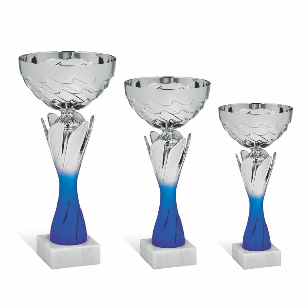 Komplet pokalov v srebrni in modri barvi na kamnitem podstavku.
