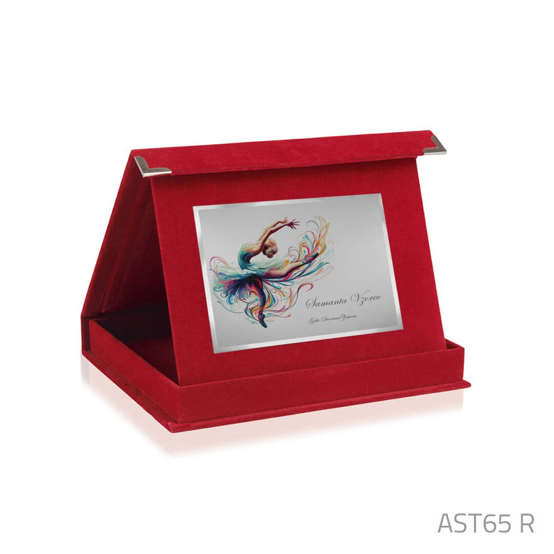Elegantna rdeča žametna škatla, višine 30 mm, primerna za pravokotne plakete. Na voljo v 4 različnih velikostih. (Grafika in plaketa na slikah služijo samo v ilustrativne namene). Plakete so naprodaj ločeno!